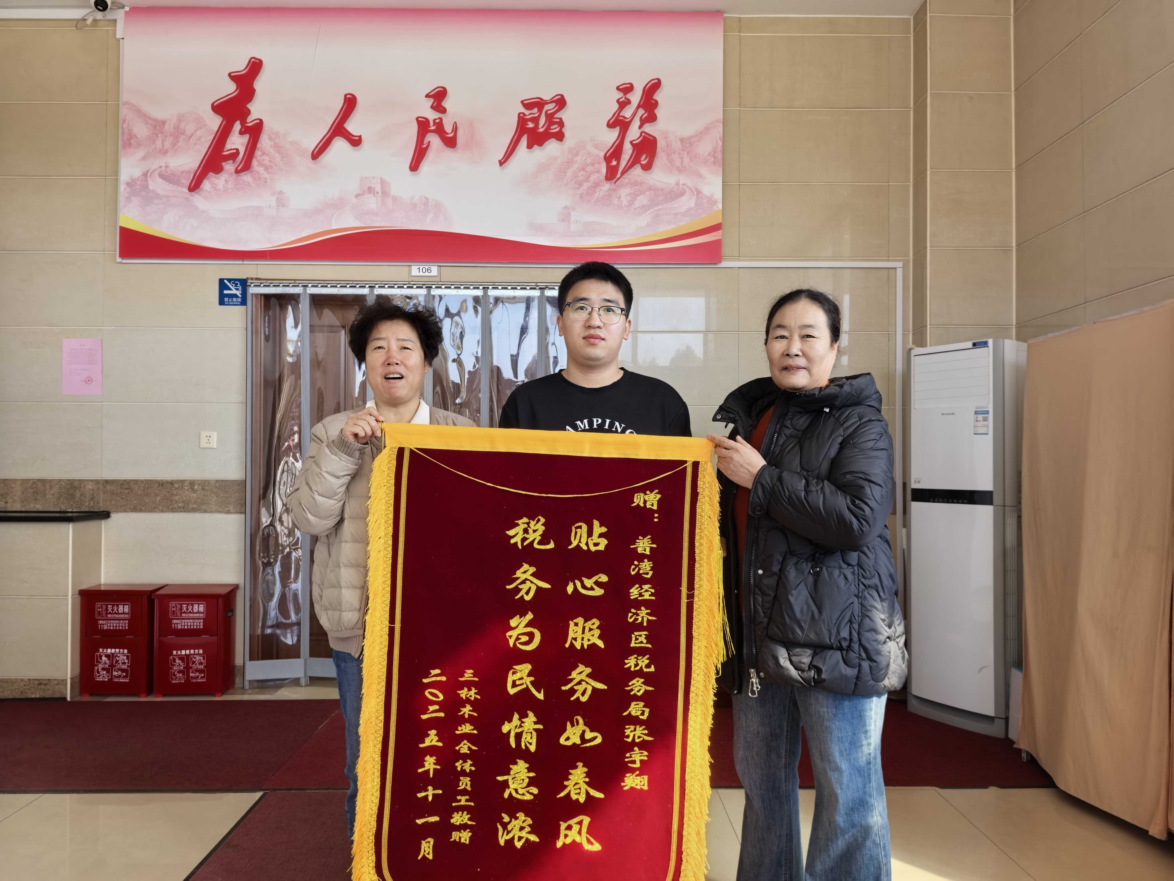 近日,普湾经济区税务局收到了一份来自大连三林木业有限公司全体员工的深厚情谊——企业委派职工代表专程送来一面锦旗,旗面上“税务为民情意浓,贴心服务如春风”的字样,表达了全体员工对税务人员在其社保补缴工作中提供鼎力支持的衷心感谢。